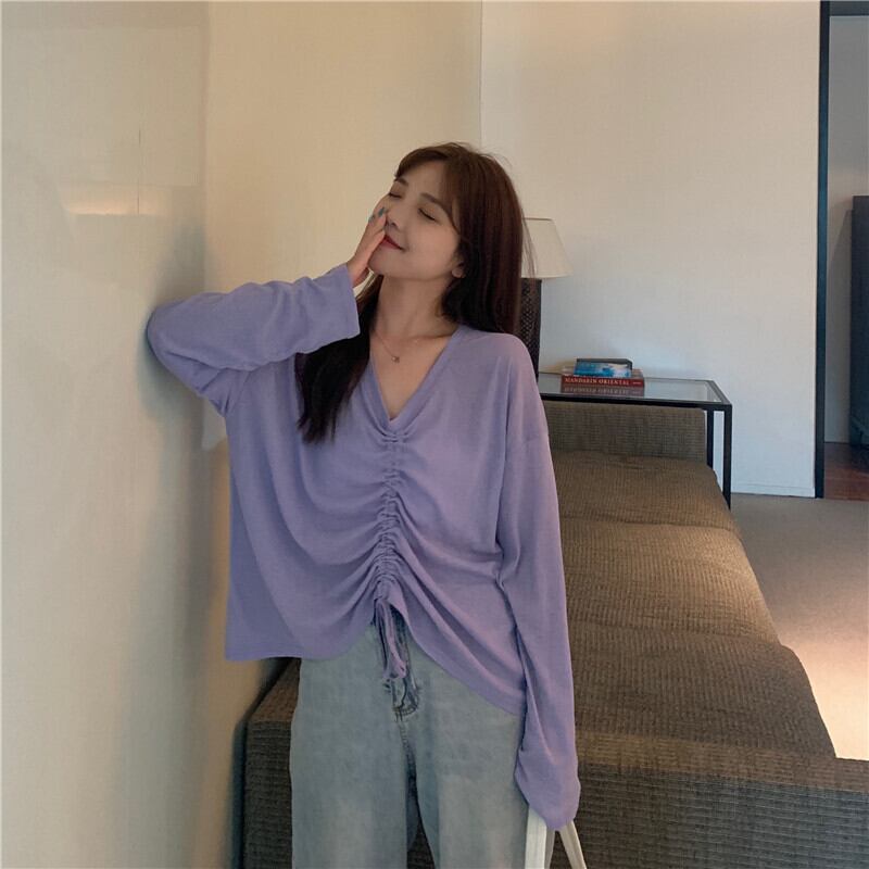 オータムルーズVネックTシャツ レッドトップス ロング 秋物 パープル タオタオイ96380347244