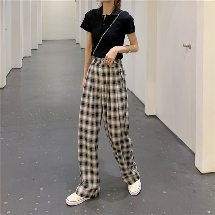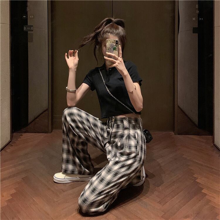 ネットレッドファッションスーツレディース2020年夏ハイウエストチェック柄カジュアルパンツ+半袖Tシャツツーピーストレンドの新バージョン タオタオイ59361893089