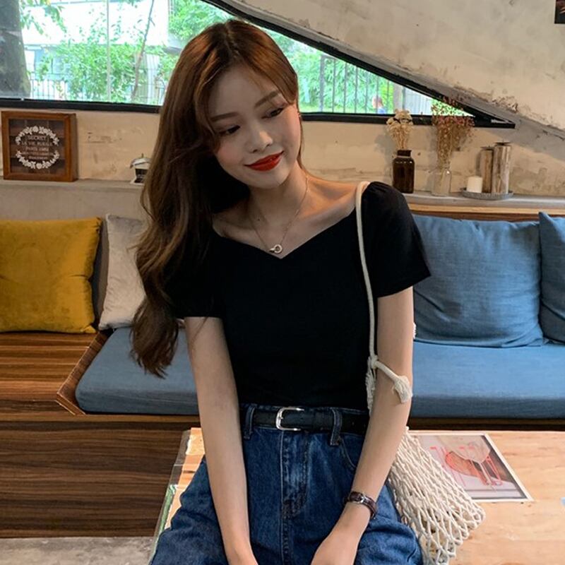 黒のVネック半袖Tシャツ女性の2020年夏のスリムで薄いワイルドインスーパーファイアショートトップの新バージョン タオタオイ29266082698