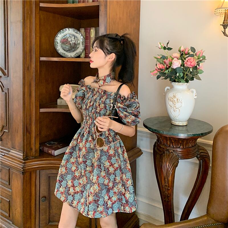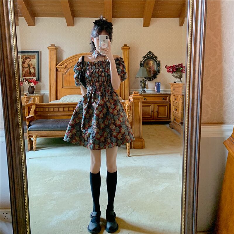 フランスのニッチなパフスリーブドレス女性2020年夏新しいウエストスリムフローラルスカート小さなaラインスカート タオタオイ66384352421