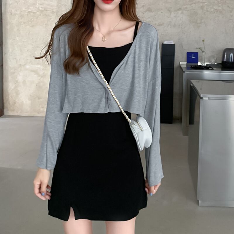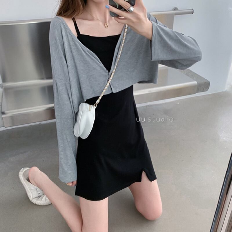色:グレーカーディガンワンピース,ブラックサスペンダードレスワンピース