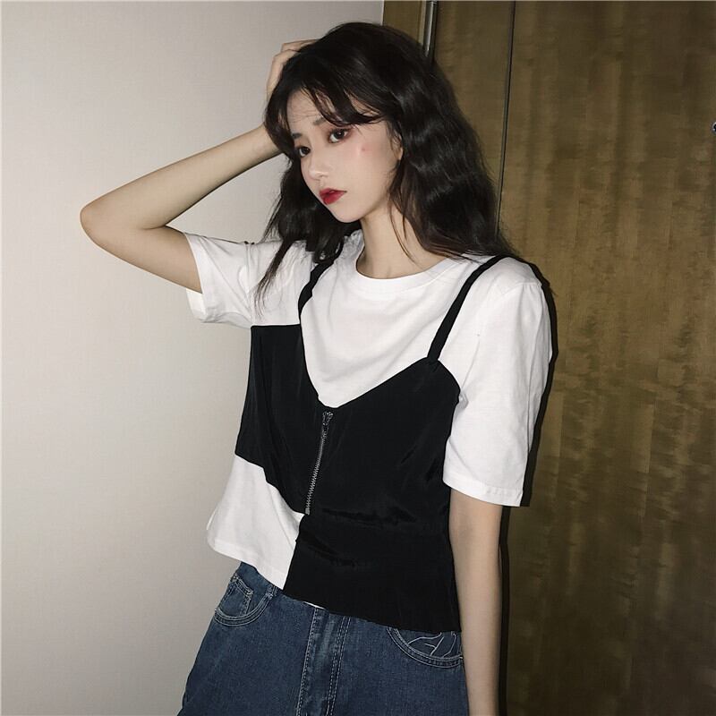 ステッチフェイクツーピース半袖Tシャツ女性インタイド2020年夏新バージョンのネットレッドワイルドルーズショートトップ タオタオイ81696675210