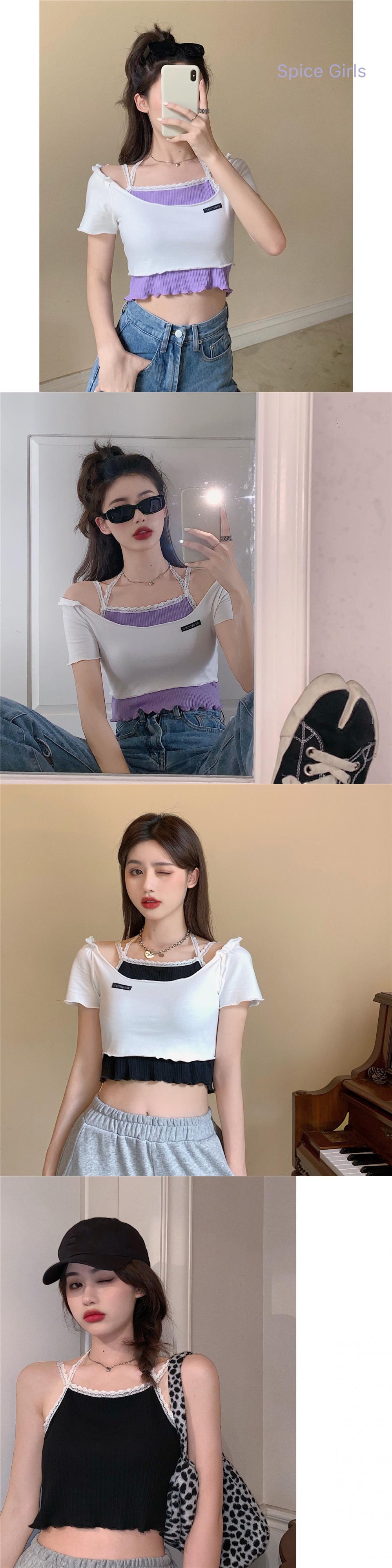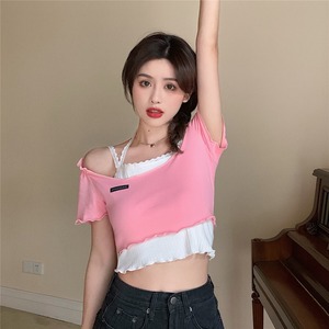 ワンショルダーショートクロップトップ2020年夏新作センスピンク半袖Tシャツ女性イントレンド タオタオイ69575271106