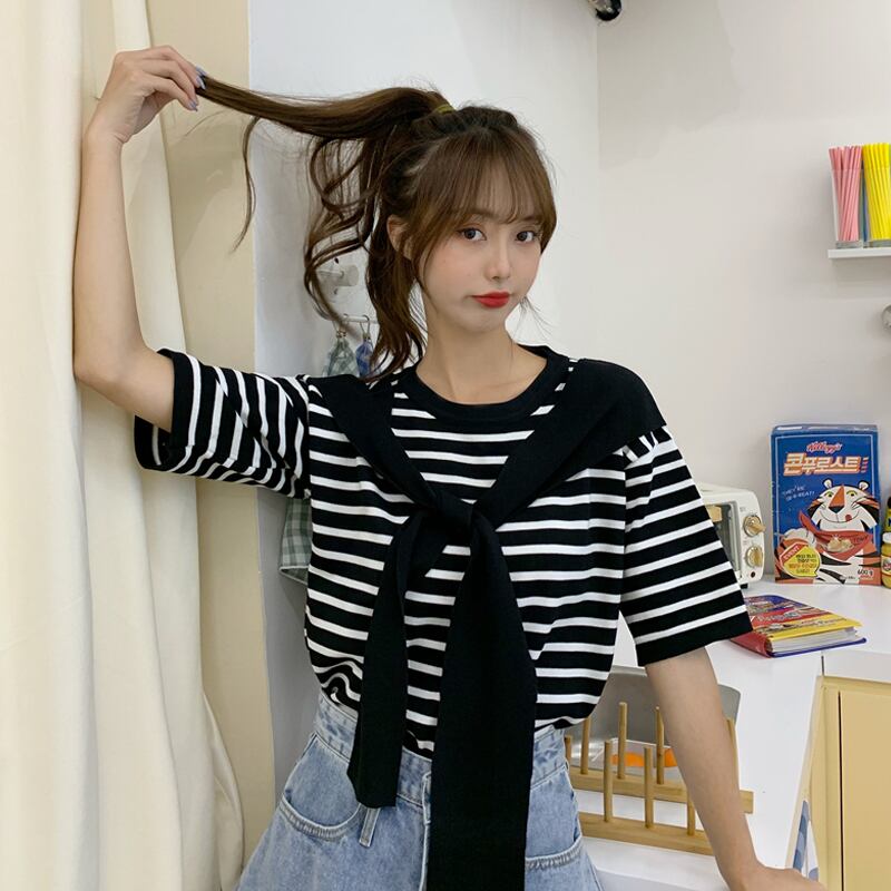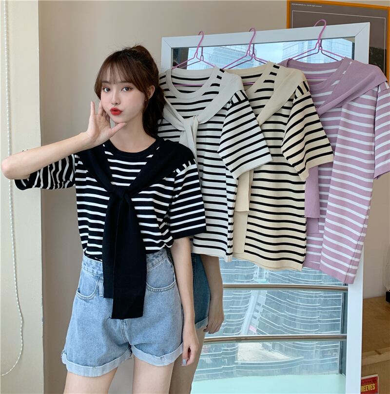 2020年夏の新しいスタイルのルーズなデザインのストライプの半袖セーターの女性は、ツーピースのショールプルオーバートップを偽造しています タオタオイ49384916975