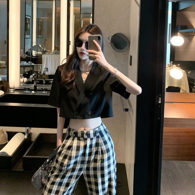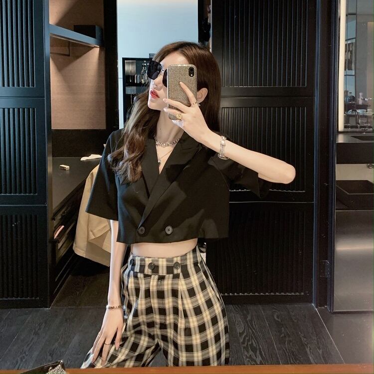 2020年夏の新しいショートスーツジャケットハイウエストチェック柄カジュアルパンツツーピースファッションスーツ女性 タオタオイ56980030753