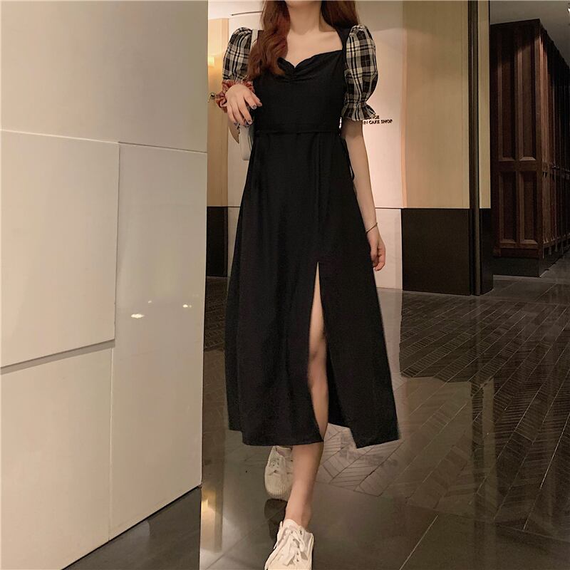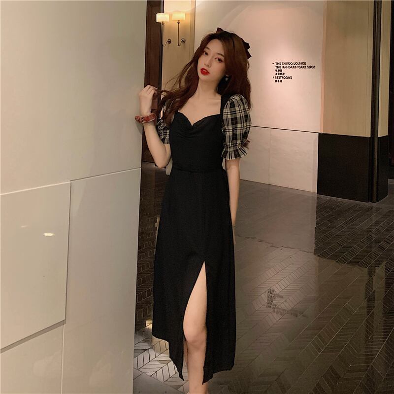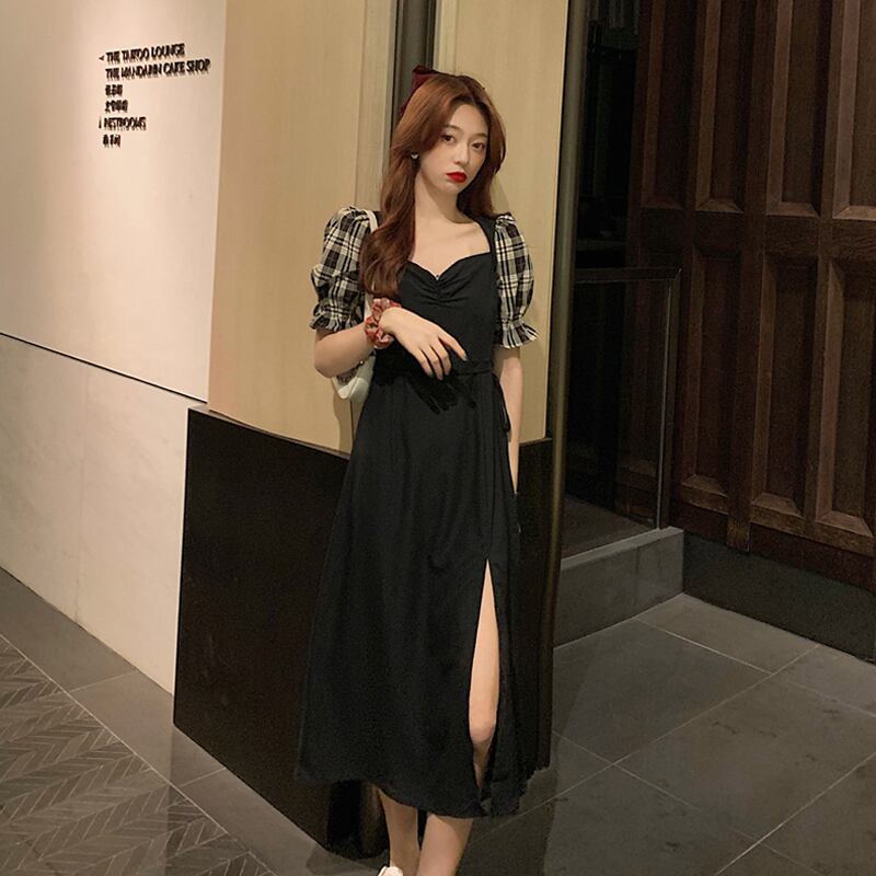 チェック柄パフスリーブドレスレディース2020新夏気質ロングスカートフレンチニッチスプリットロングスカート タオタオイ35665784598