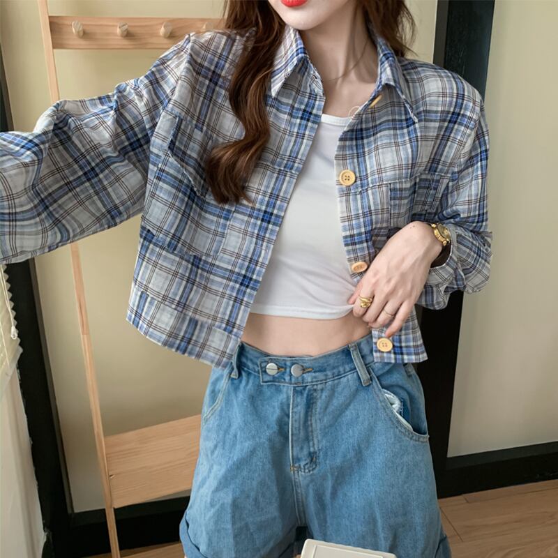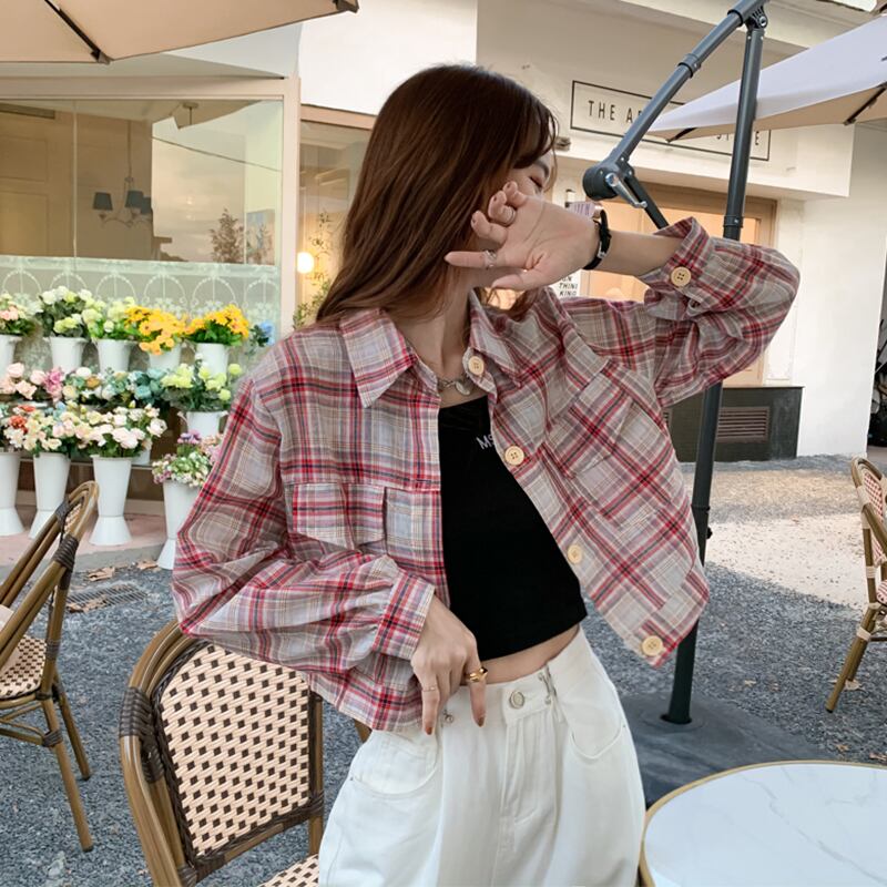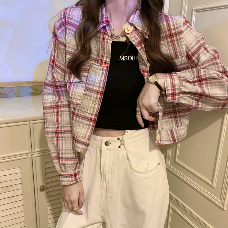 チェック柄長袖シャツレディース2020年夏ワイルドルーズショートトップレトロシャツジャケットの新バージョン タオタオイ55627881134