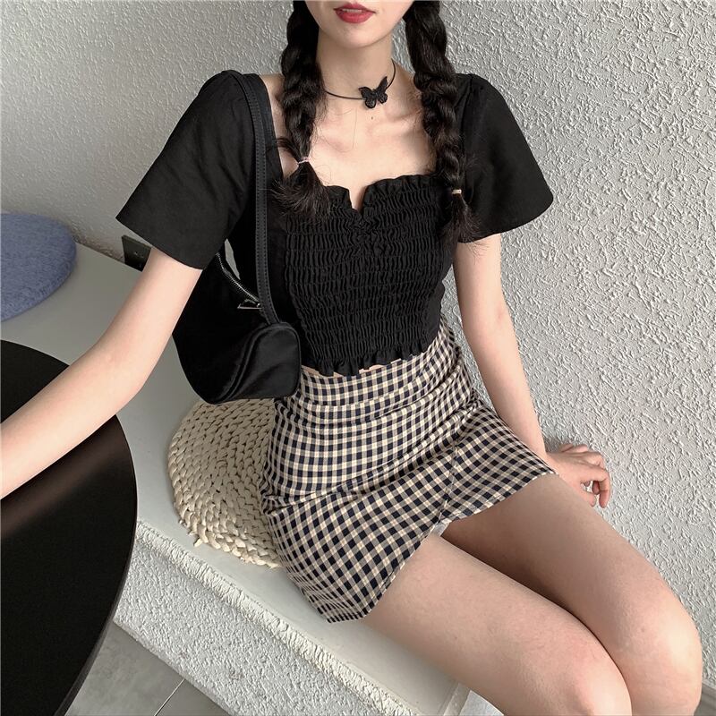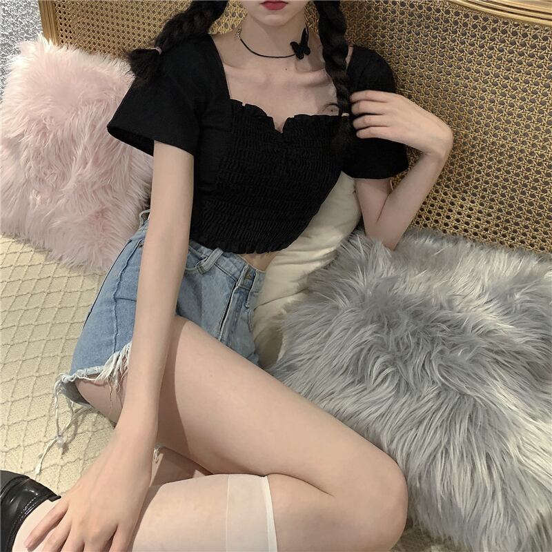 2020年夏の新しいフレンチスクエアネック半袖シャツレディースショートトップは薄くて用途の広いデザインのニッチシャツです タオタオイ6882714511
