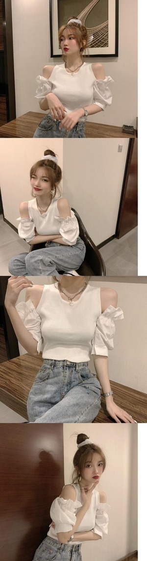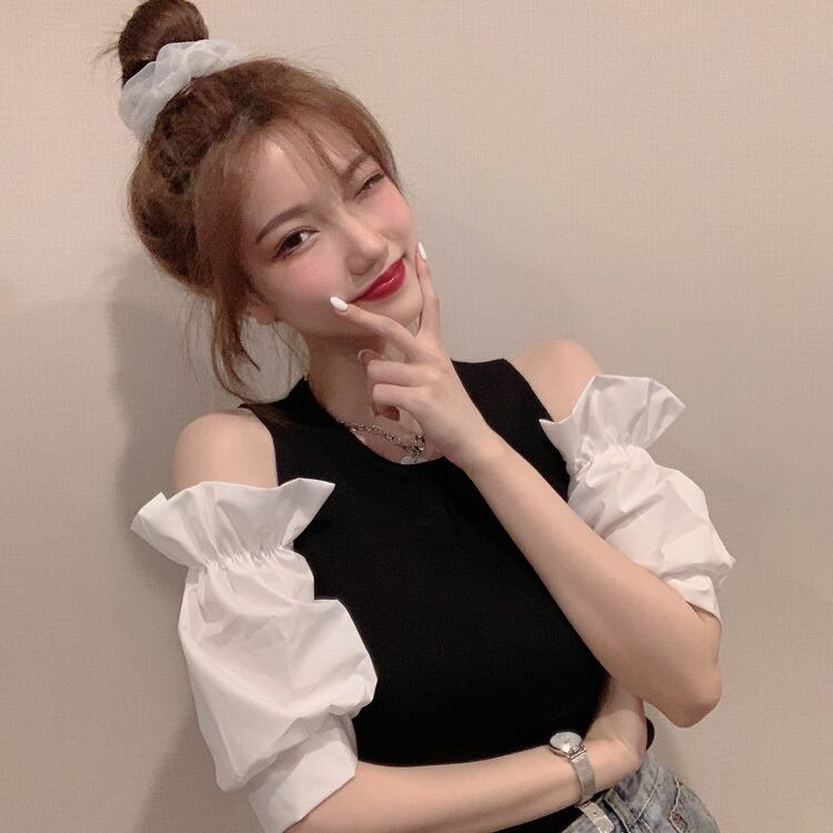 2020年夏の新バージョンの黒の半袖セーター女性デザインセンスパフスリーブオールマッチスリムオフショルダートップ タオタオイ20224754726