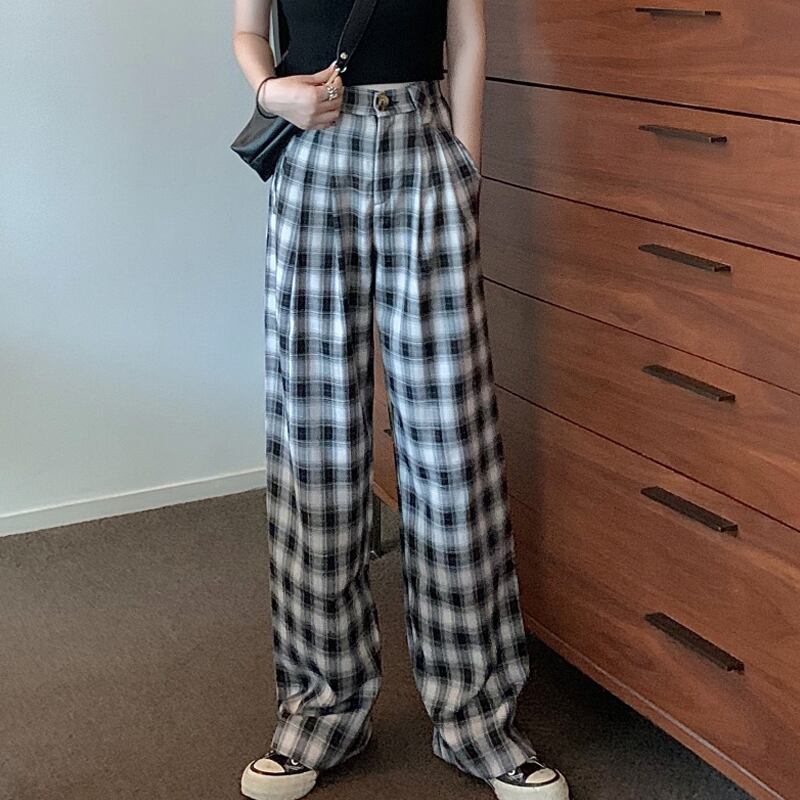 チェック柄パンツ2020年夏新作ストレートルーズパンツワイドレッグパンツハイウエストスリミングカジュアルパンツレディースモップパンツ タオタオイ70089942366
