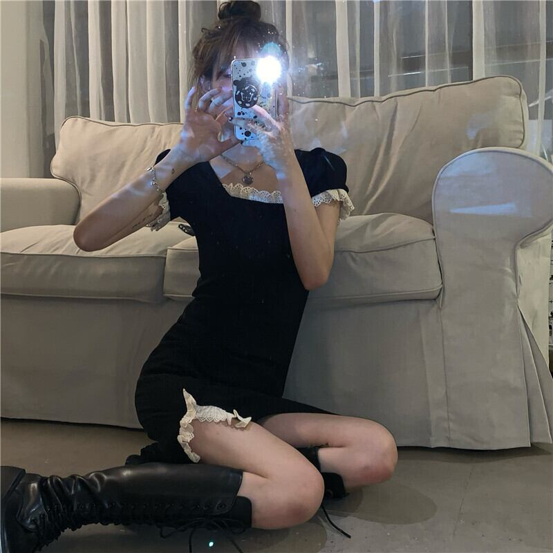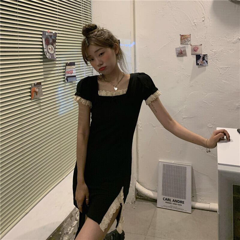 レーススリットスカートリトルブラックドレス2020年夏新バージョンフレンチニッチスクエアネックパフスリーブドレス女性 タオタオイ26977485497