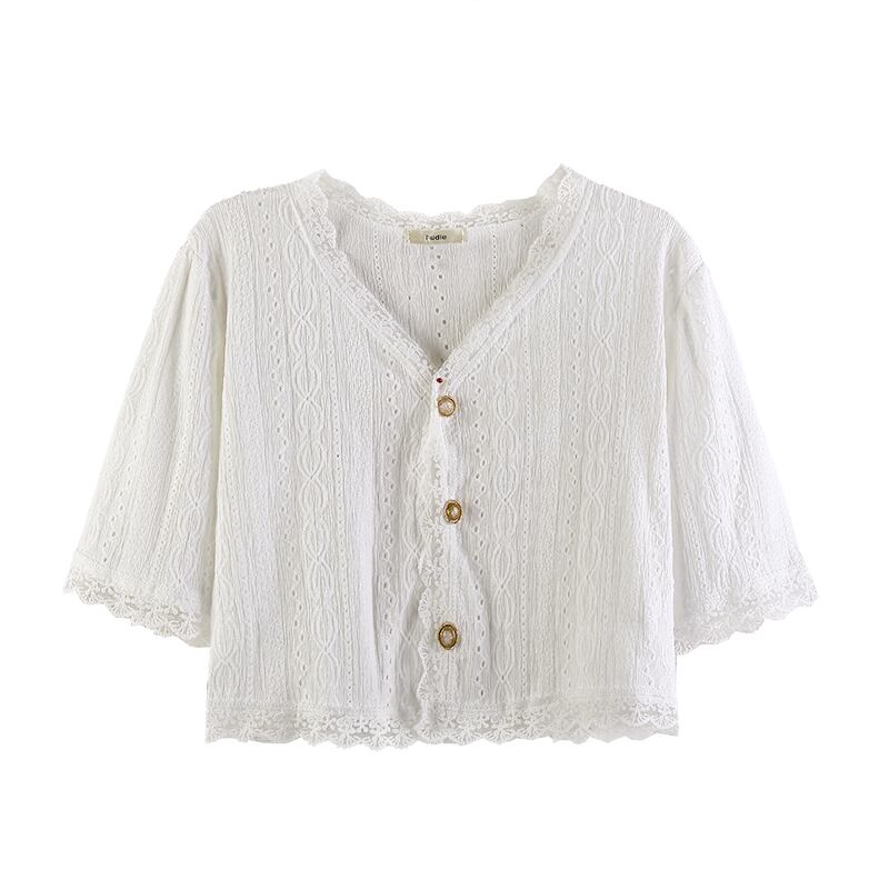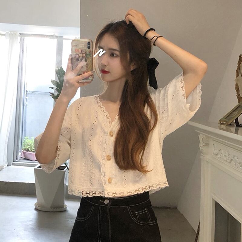 優しいクロップトップ2020年夏新バージョンフレンチスウィートVネックホワイト半袖レースシャツレディーススモールシャツ タオタオイ21047545110