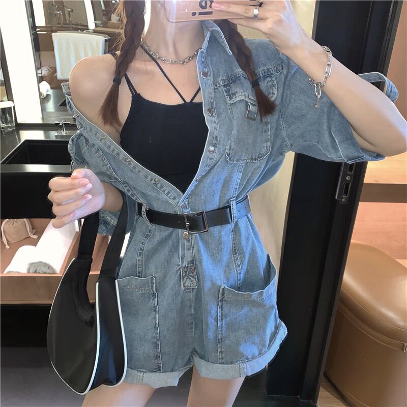 レトロオーバーオール2020年夏新作パンツハイウエストジーンズワイドレッグショーツネットレッドジャンプスーツレディース タオタオイ33844514144