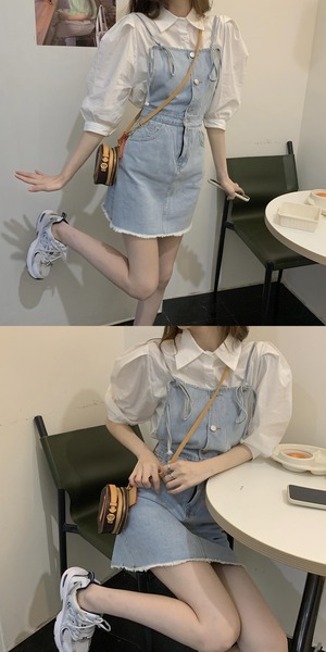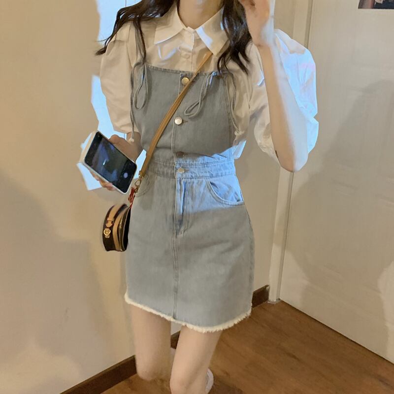 スーツ女性2020年夏新作ルーズホワイトシャツデニムスカートストラップスカートウエスタンスタイルツーピーススーツ タオタオイ15605106249