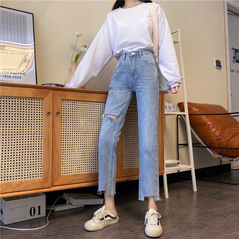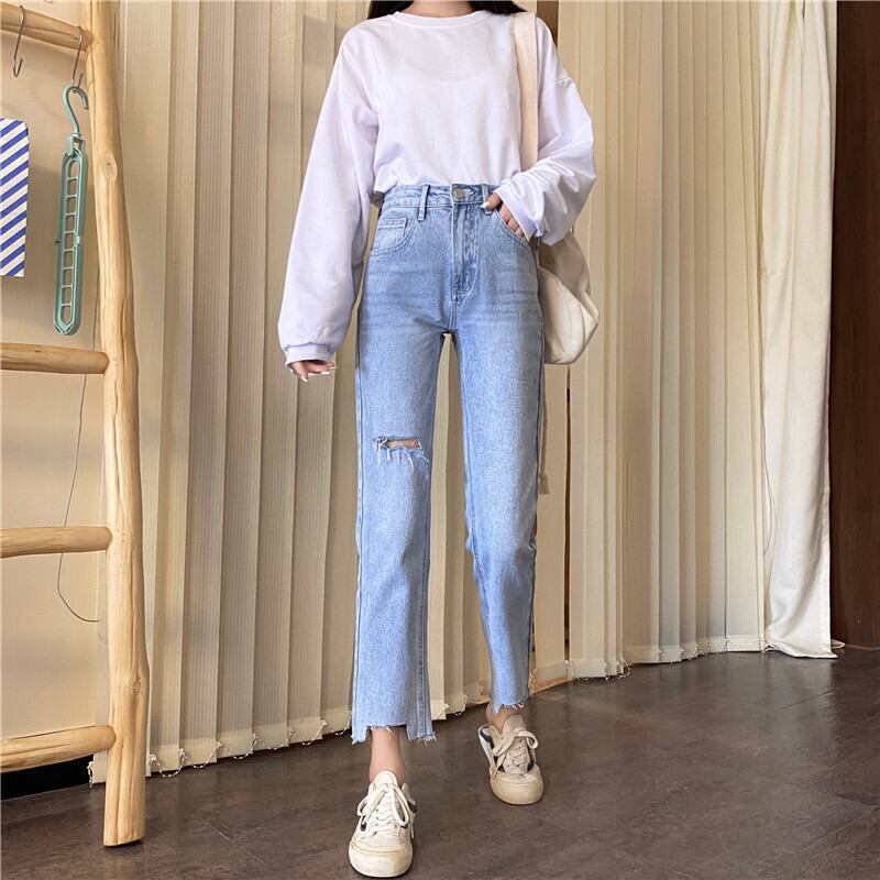 淡い色の破れたハイウエストジーンズの女性の2020年秋新しいルーズストレートレッグパンツは薄くて用途の広い9ポイントパンツです タオタオイ56731026680