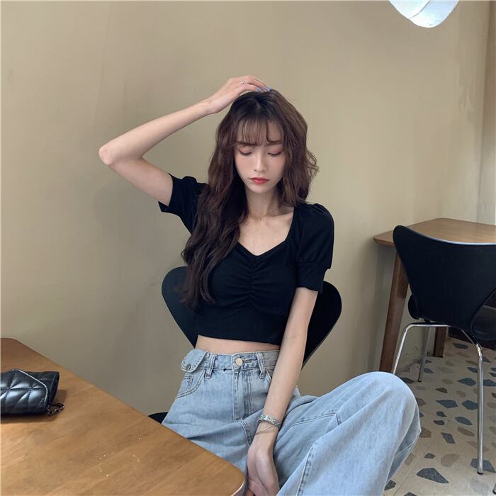 フランスのスクエアネックパフスリーブニットトップ2020年夏新バージョンのスリムで薄い黒の半袖Tシャツ女性 タオタオイ7249508326