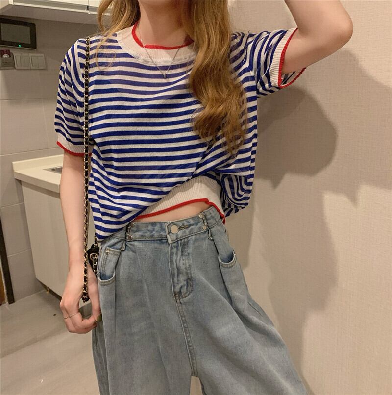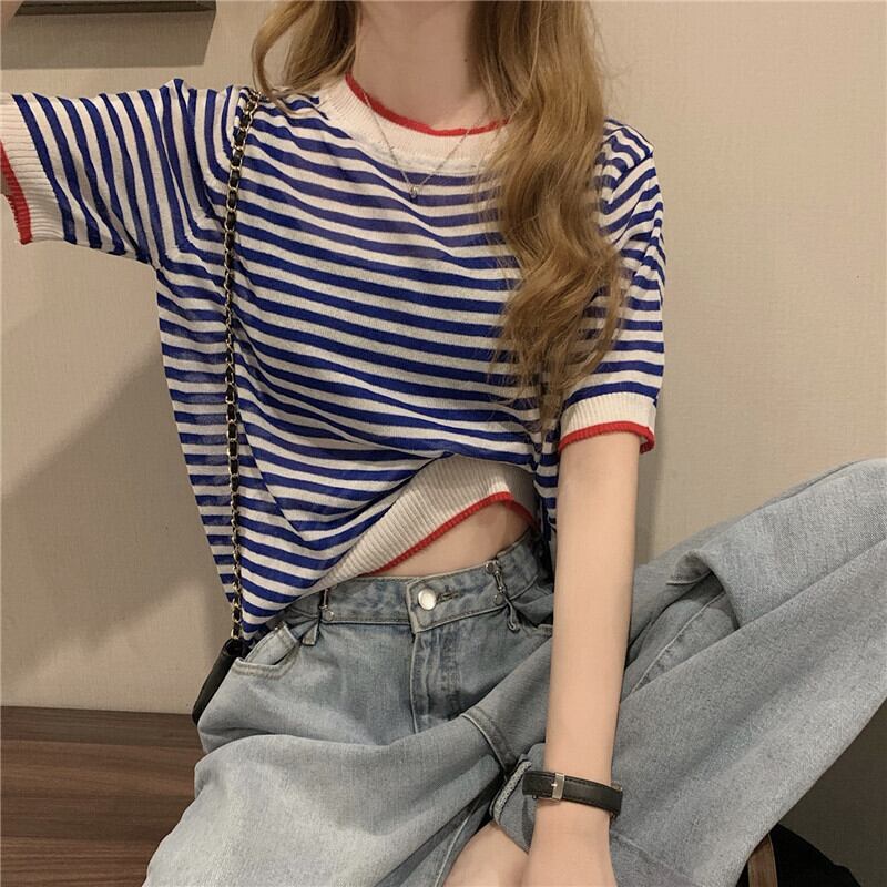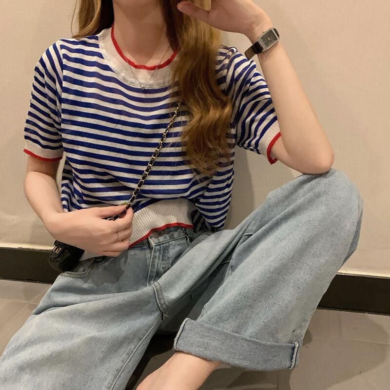スクエアカラーストライプアイスシルクニットTシャツレディース2020年夏新バージョンルーズネットレッド半袖トップスチューデントトレンド タオタオイ11446648746