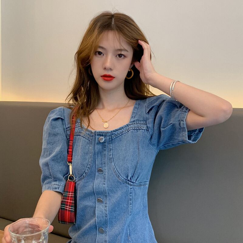 2020年夏のフランスのスクエアネックパフスリーブドレスの新しいバージョンの女性のカウボーイスカートは薄い気質のAラインスカートです タオタオイ32626999003