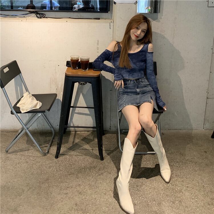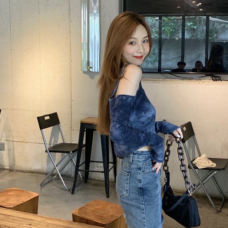 ネットレッドオフショルダー長袖Tシャツレディース2020年夏新作インスーパーファイヤーデザインセンスのスリムショートクロップトップ タオタオイ33348808088