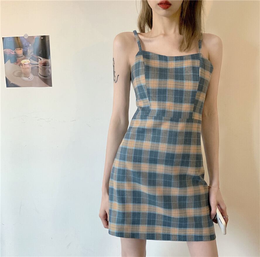 フランスの初恋スカート2020年夏新しい小さな格子縞のサスペンダースカート細いウエストドレス女性のAラインスカート タオタオイ10306440258