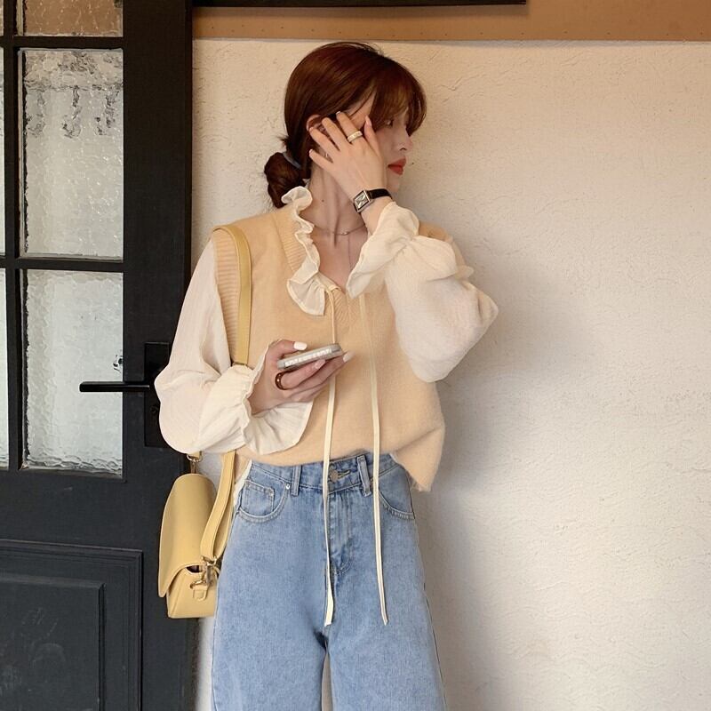 色:アプリコットシフォンシャツ,ミルクカーキベスト一枚