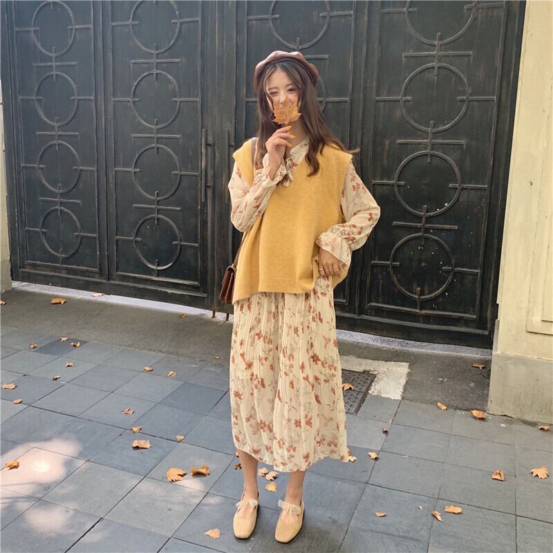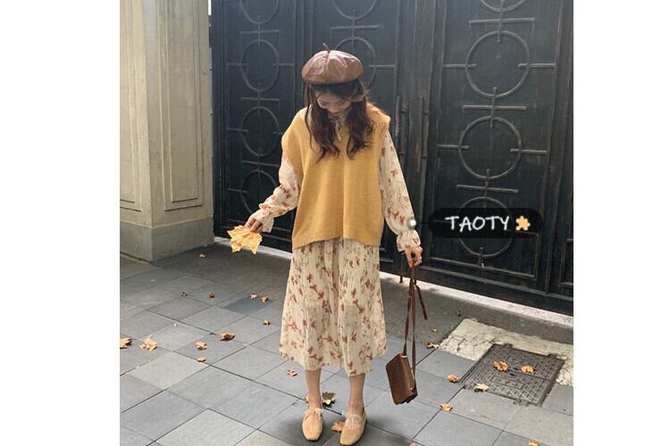 色:ガチョウの黄色いベストのワンピース,花柄スカートワンピース