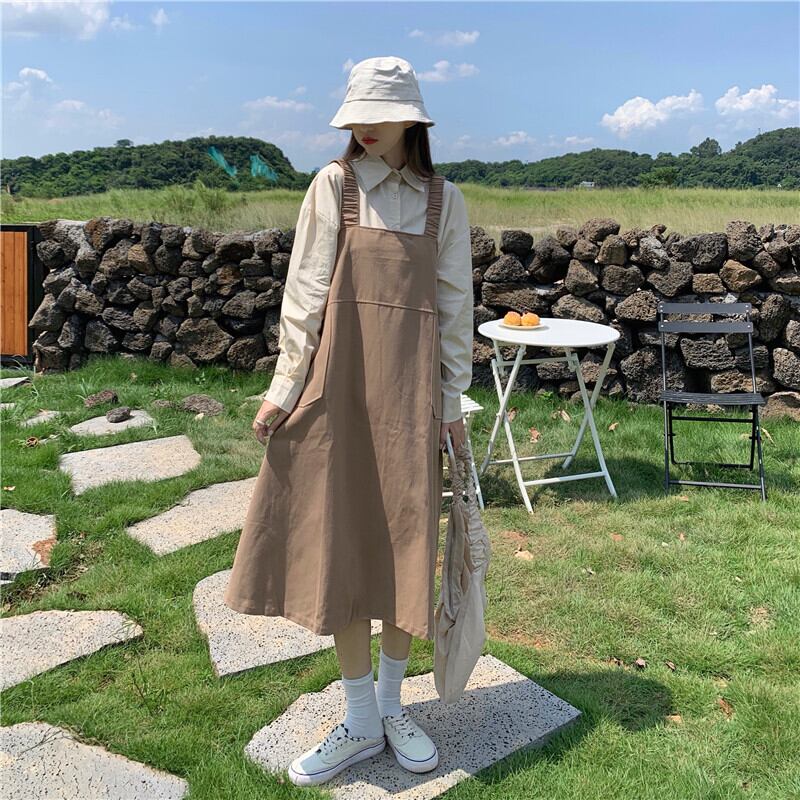 色:ワンピースアプリコットシャツ,青いシャツワンピース,シングルカーキスカート,ブラックストラップドレスワンピース