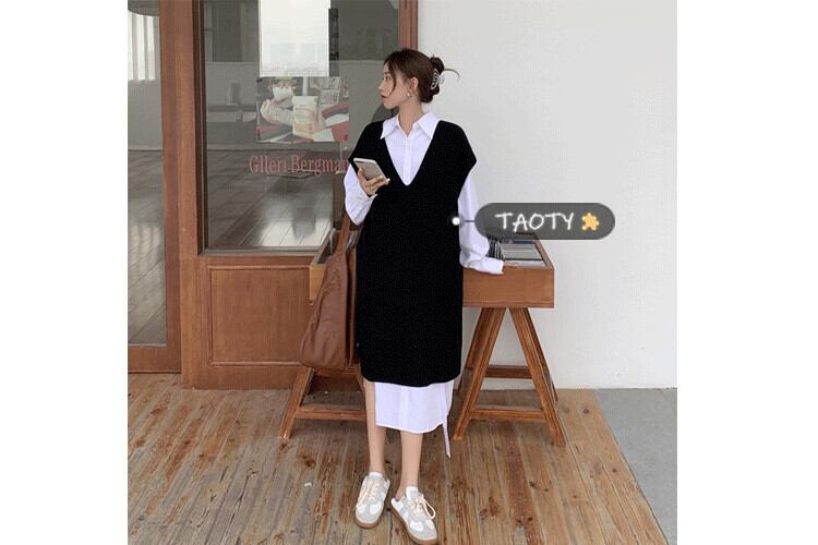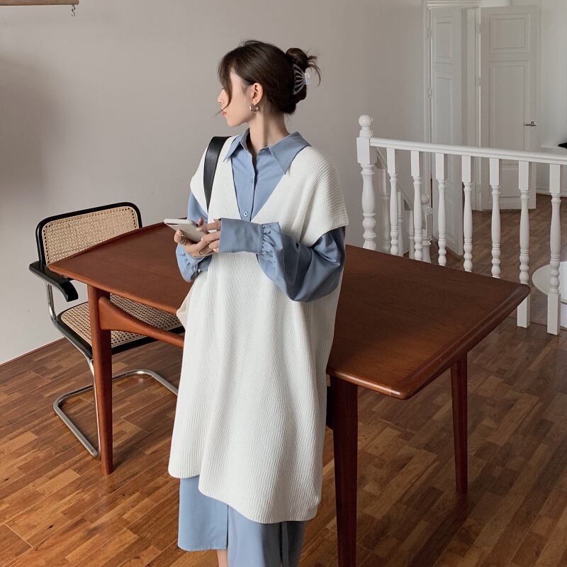 色:青いシャツ,白いシャツワンピース,ブラックベストワンピース,白いベストのワンピース