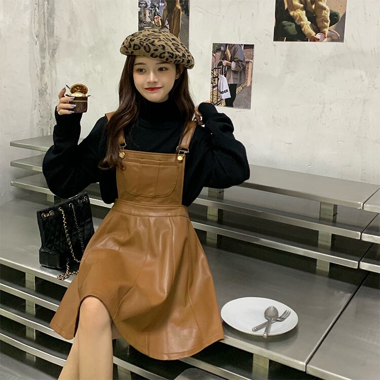 色:ストラップレザースカートワンピース,黒のセーターワンピース