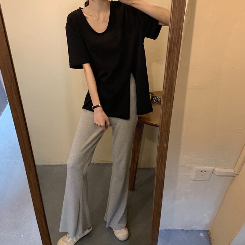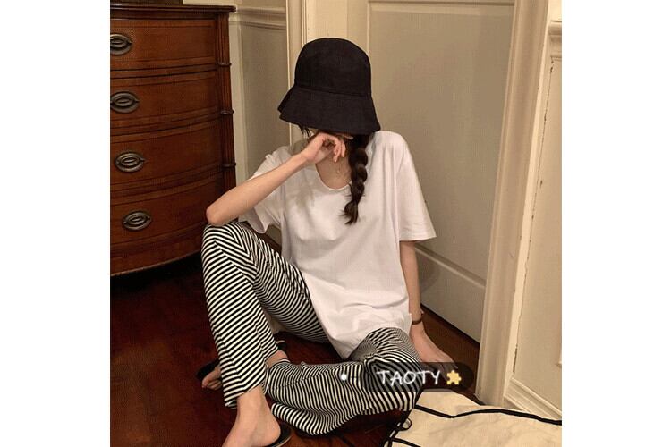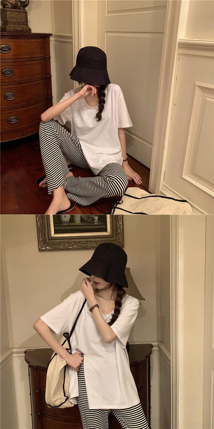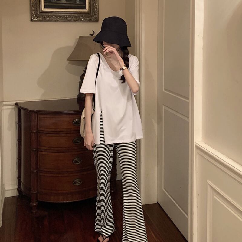 色:ホワイトTシャツシングルピース,黒のTシャツシングルピース,グレーのカジュアルパンツのワンピース,黒いスラックス,ストライプカジュアルパンツ