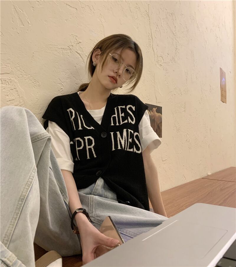 スタンダードニットVネックセーター スプリングオータムルーズカジュアルノースリーブ レトロ 春物 秋物 タオタオイ82781355326