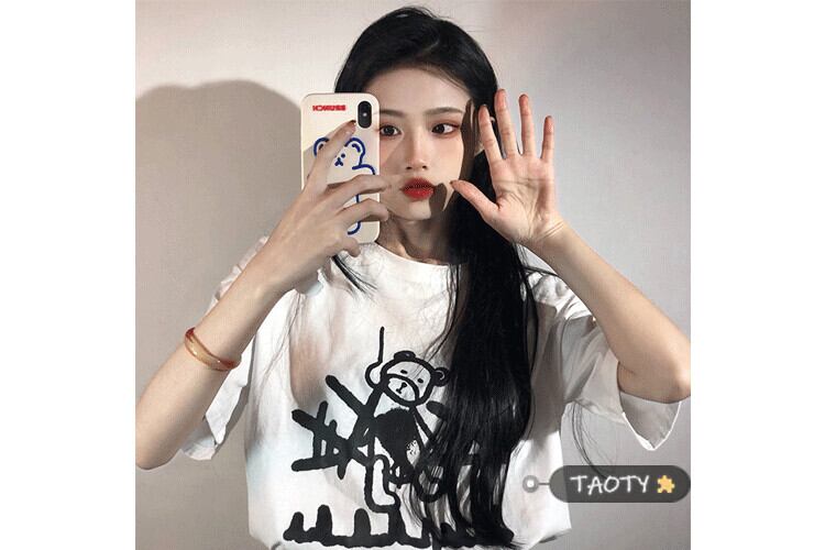 プリント柄Tシャツ サマーレッドルーズ薄手トップス ストリート 夏物 タオタオイ61435560082