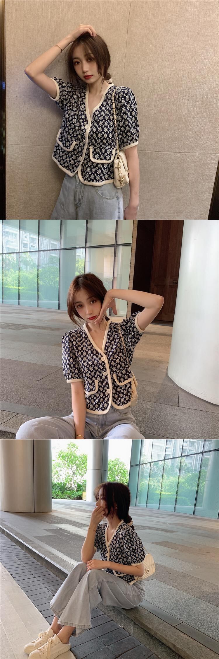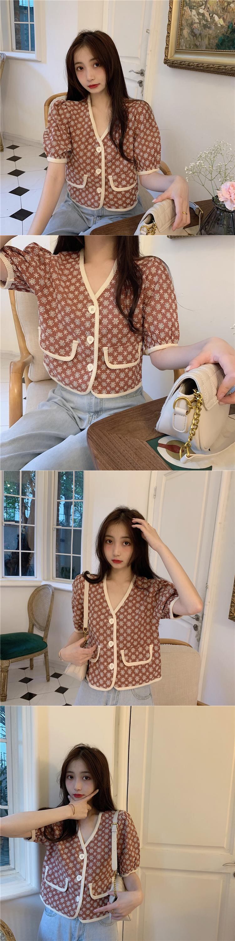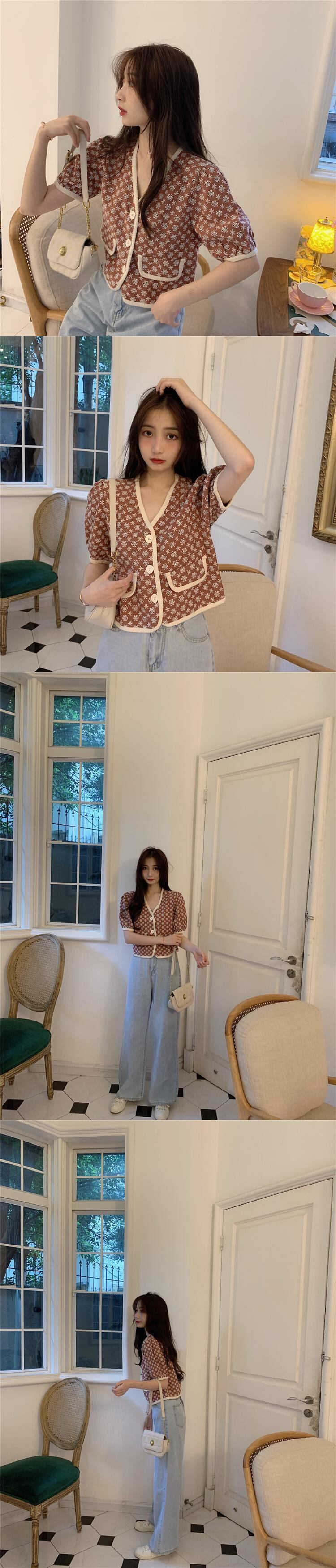 Vネックショートスリーブシャツ レディーススタンダードサマートップス レトロ 夏物 タオタオイ92939529749