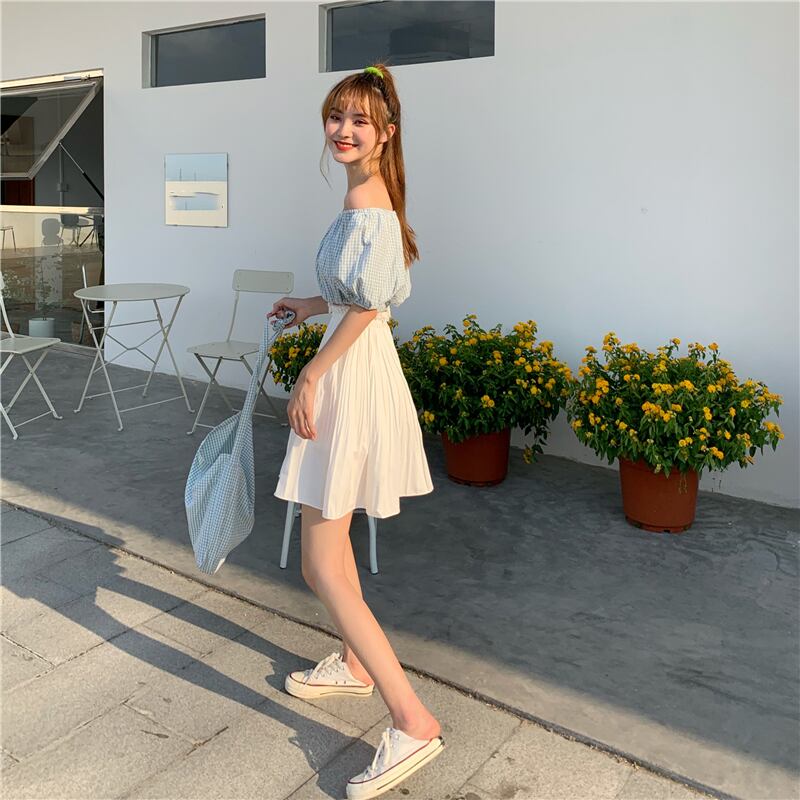 色:ブルーチェックトップフリーバッグ,ブラックグリッドトップフリーバッグ,白いプリーツスカートのワンピース,ブラックプリーツスカートシングルピース
