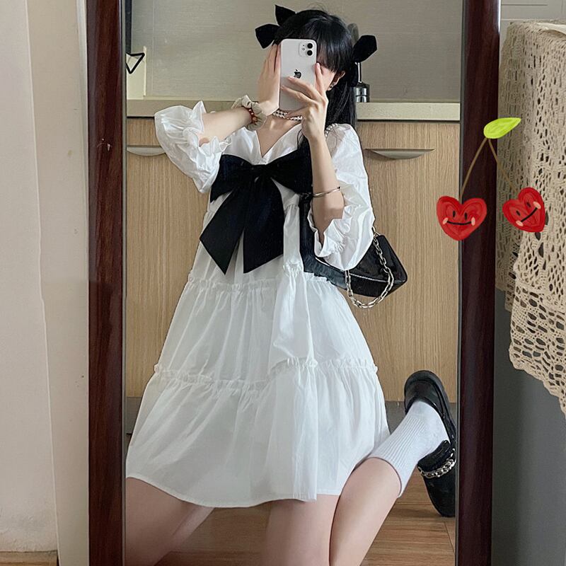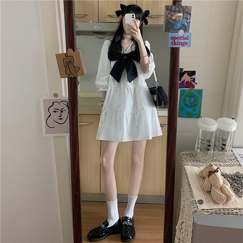 ホワイトドレス サマースリーブAラインスカート 大人ガーリー スウィート キュート カジュアル 夏物 タオタオイ42385362074