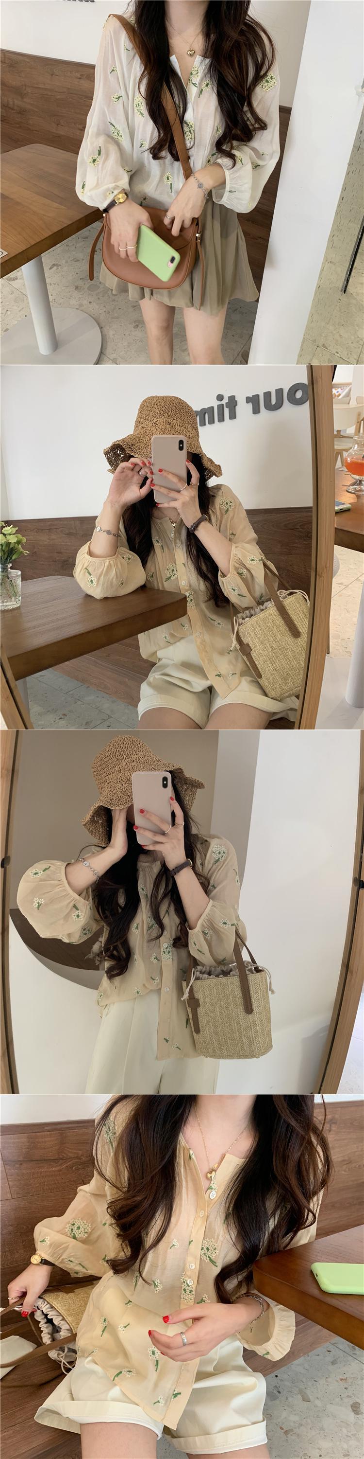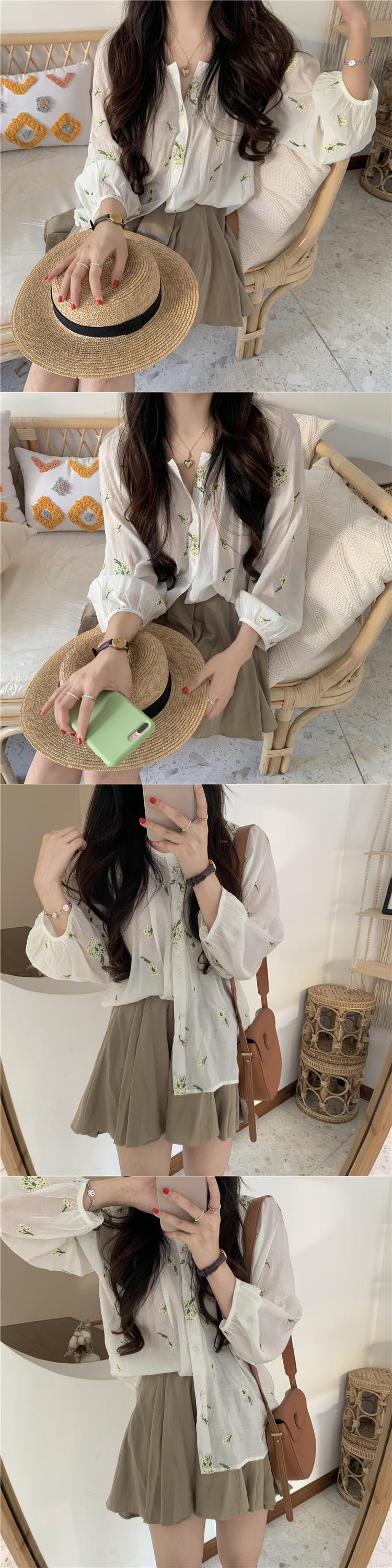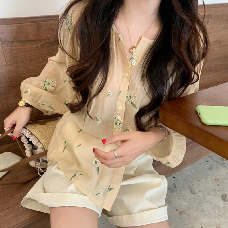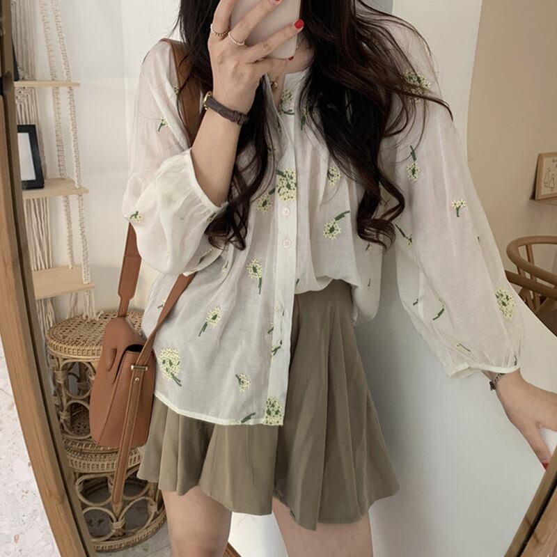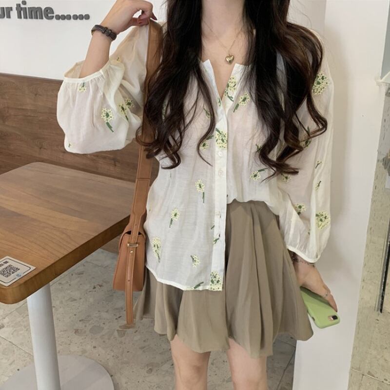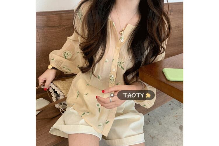 ホワイトフローラルシャツ レディーススタンダードサマー薄手トップス ロング レトロ 夏物 花柄 タオタオイ78064828050