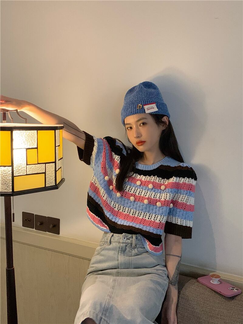 ストライプショートTシャツ サマーニット 夏物 タオタオイ91377713567