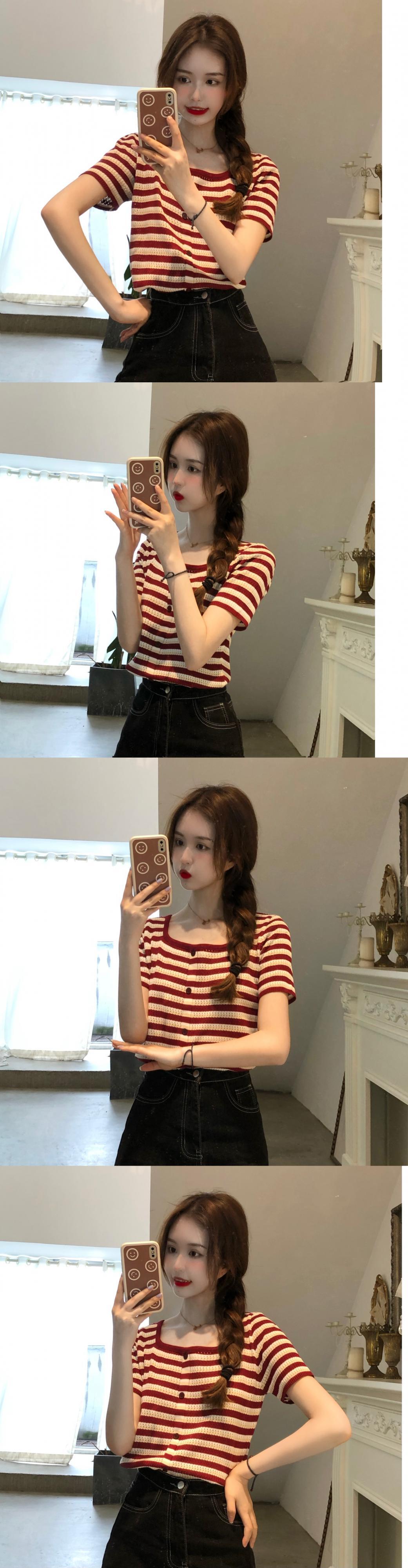 ストライプショートTシャツ サマーレッドニットトップス 夏物 スクウェア タオタオイ28974507234