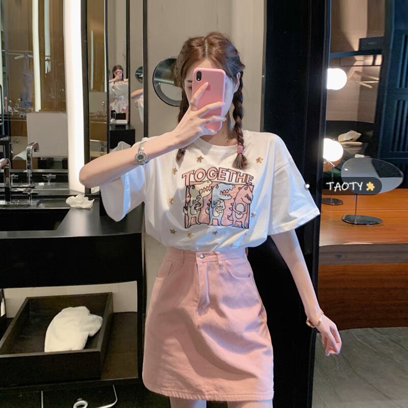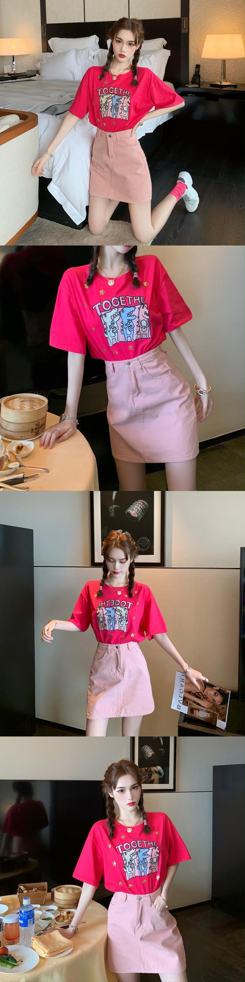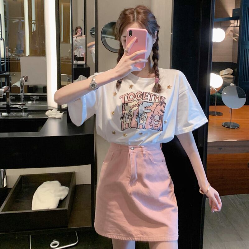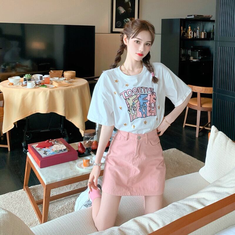 色:シングルベリーTシャツ,ホワイトTシャツシングルピース,ピンクのデニムスカートのワンピース