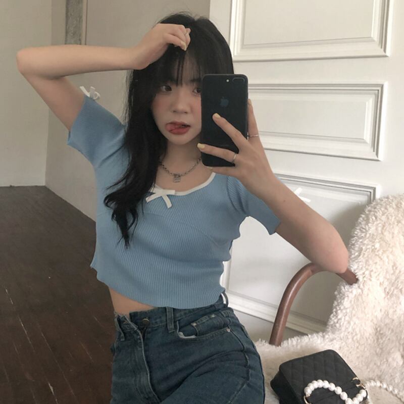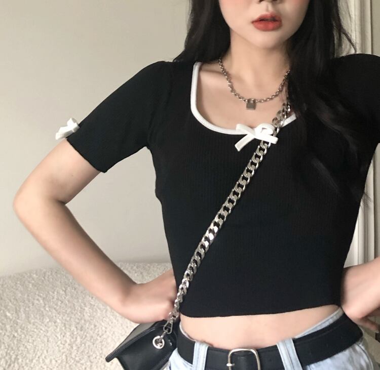 ブラックニットショートTシャツ 薄手サマースリムトップス 夏物 タオタオイ37156488789