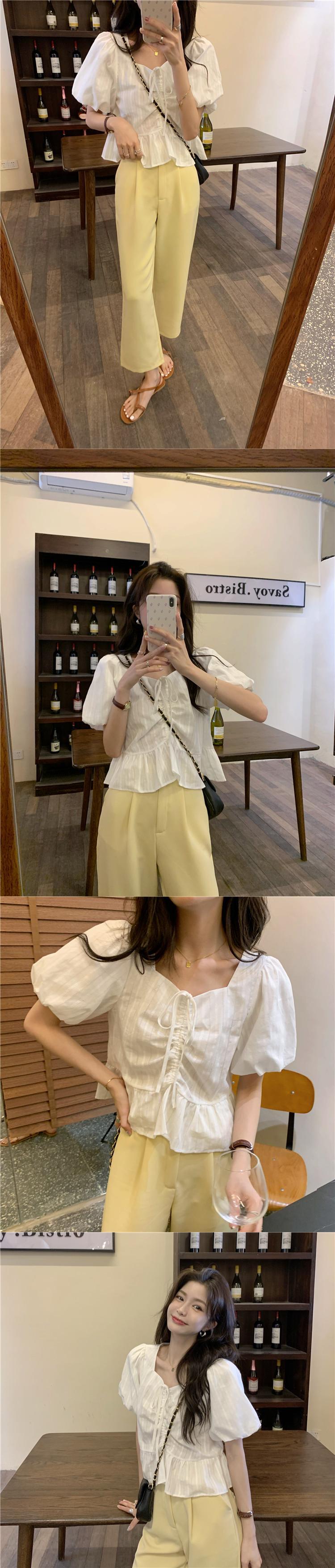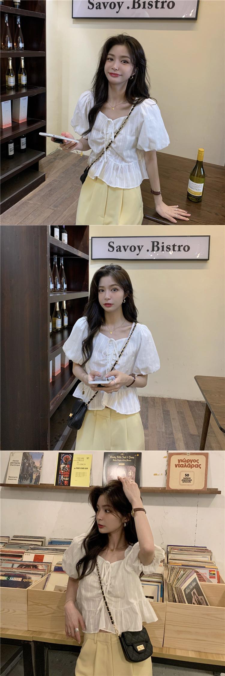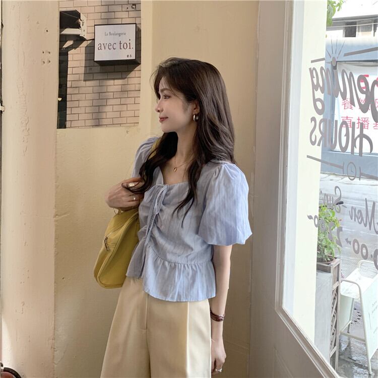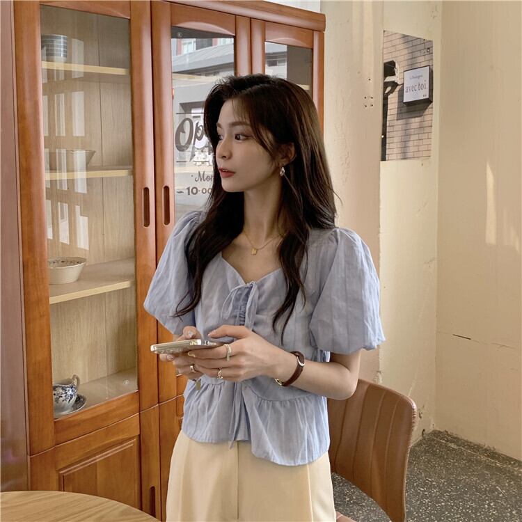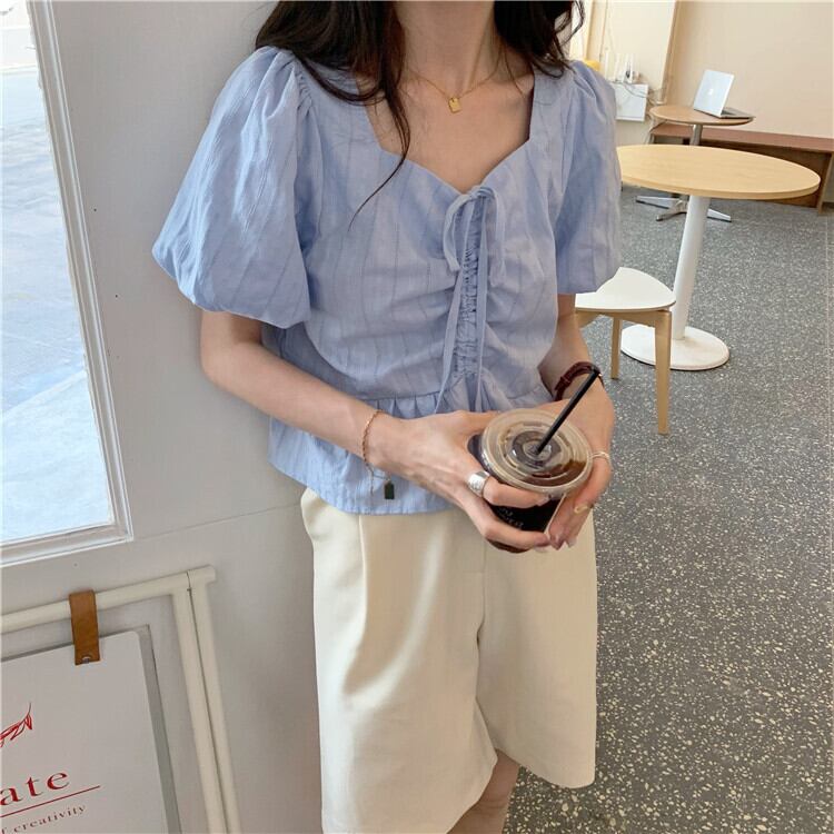 ブルーショートスリーブTシャツ サマーレッドギャザートップス ドレス 夏物 タオタオイ72959473918
