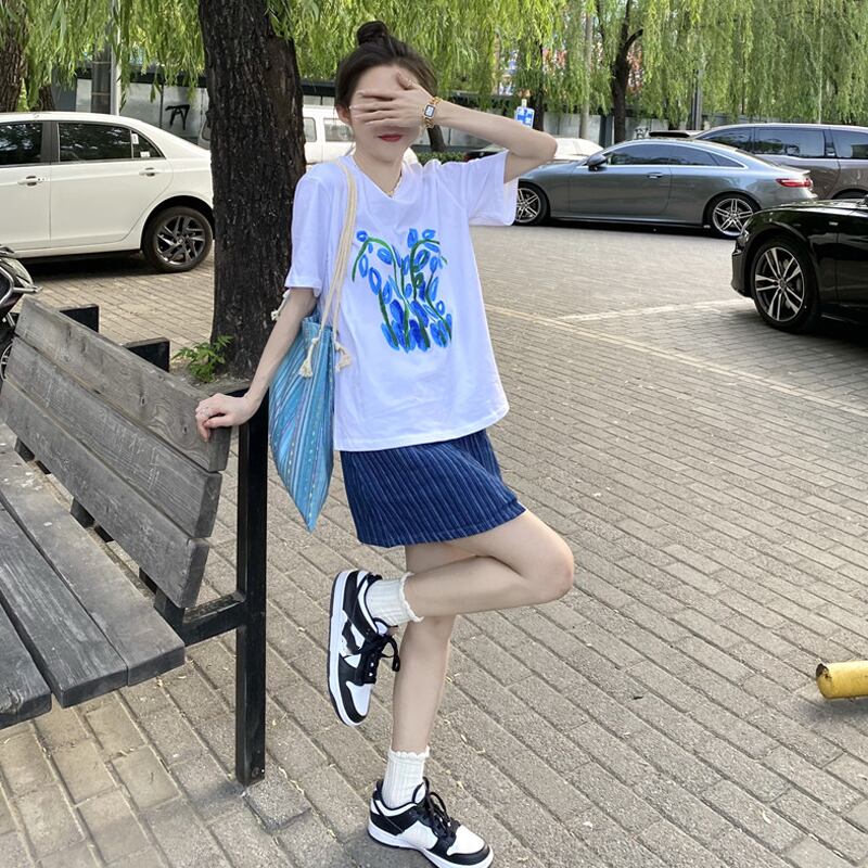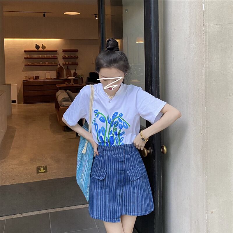 色:ストライプデニムスカートワンピース,水墨画Tシャツ1枚