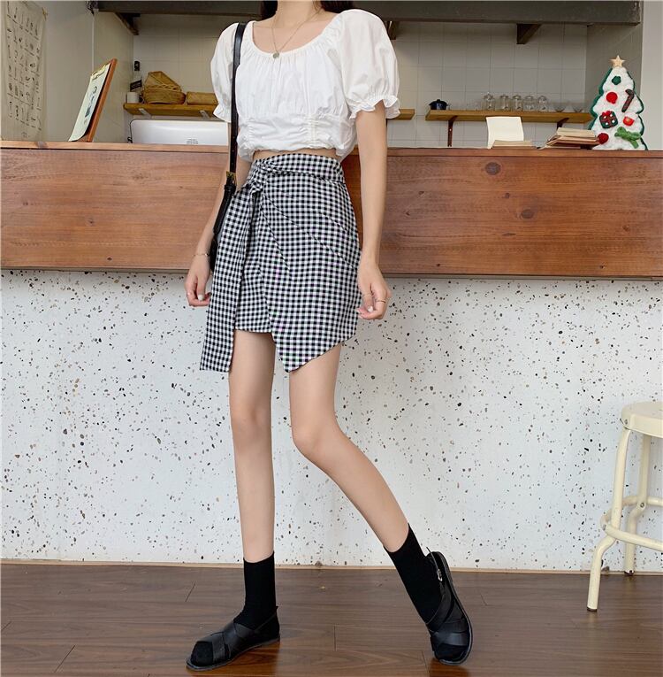 格子柄スカート ハイウェストウェストAラインサマー 夏物 タオタオイ49057563743
