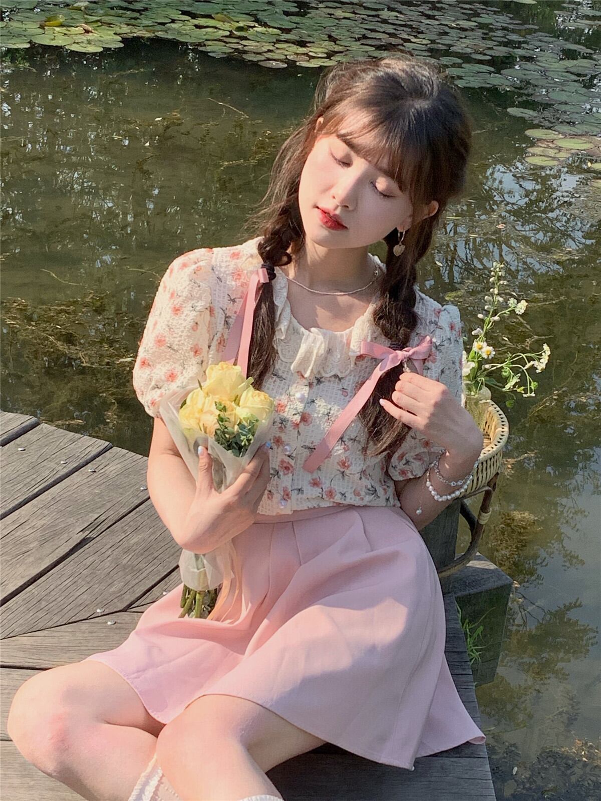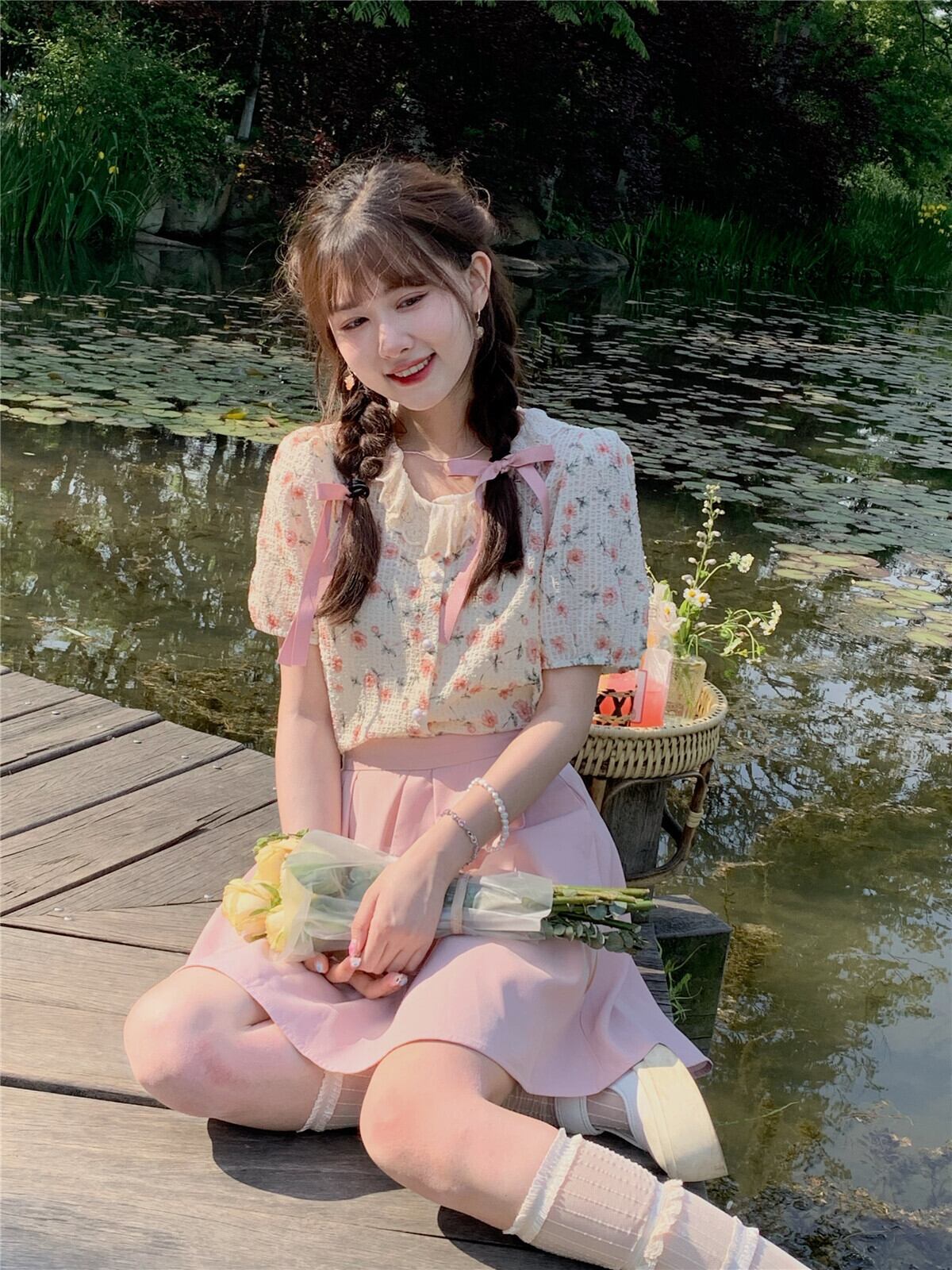 色:ワンピース花柄トップ,ピンクショートスカートワンピース