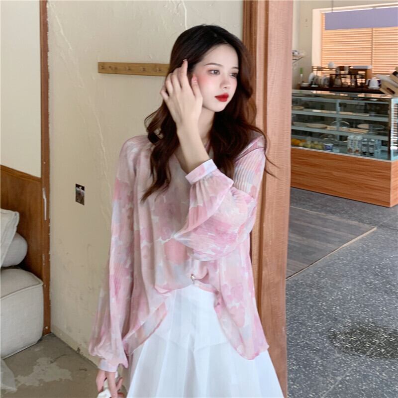 フローラルVネックシフォンシャツ サマー薄手長袖スリーブトップス ロング 夏物 花柄 タオタオイ72223535932