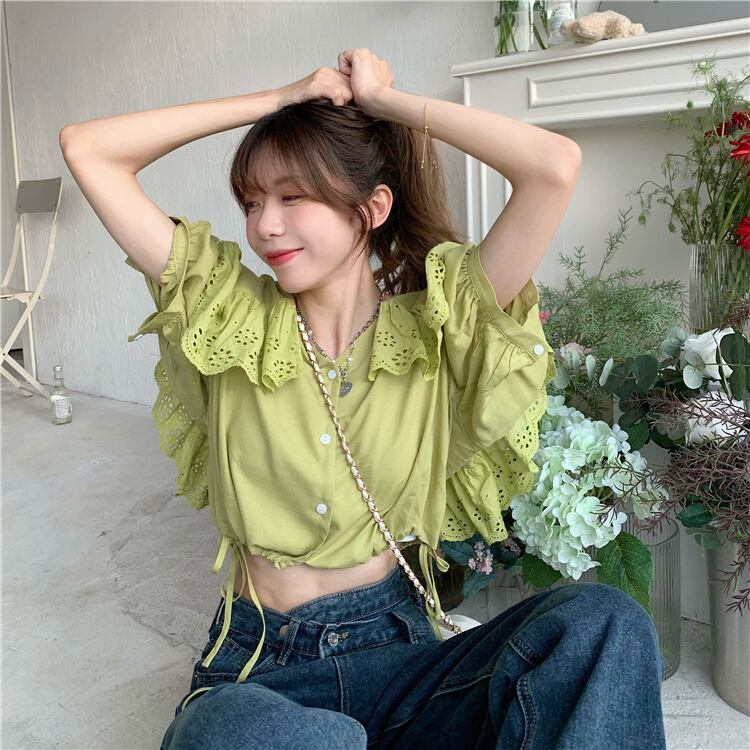 Vネックショートシャツ レディースサマースタンダードトップス レトロ 夏物 タオタオイ85213217091