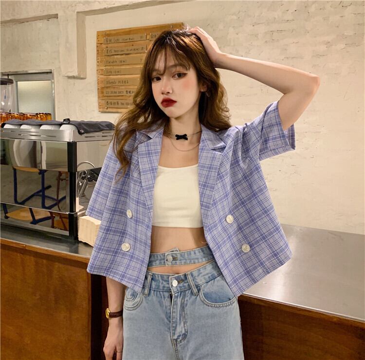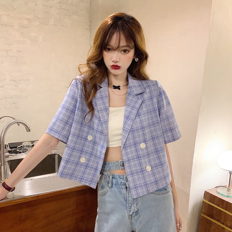 格子柄ショートジャケット サマーレッド薄手トップス 夏物 タオタオイ47194998684