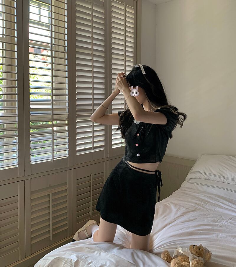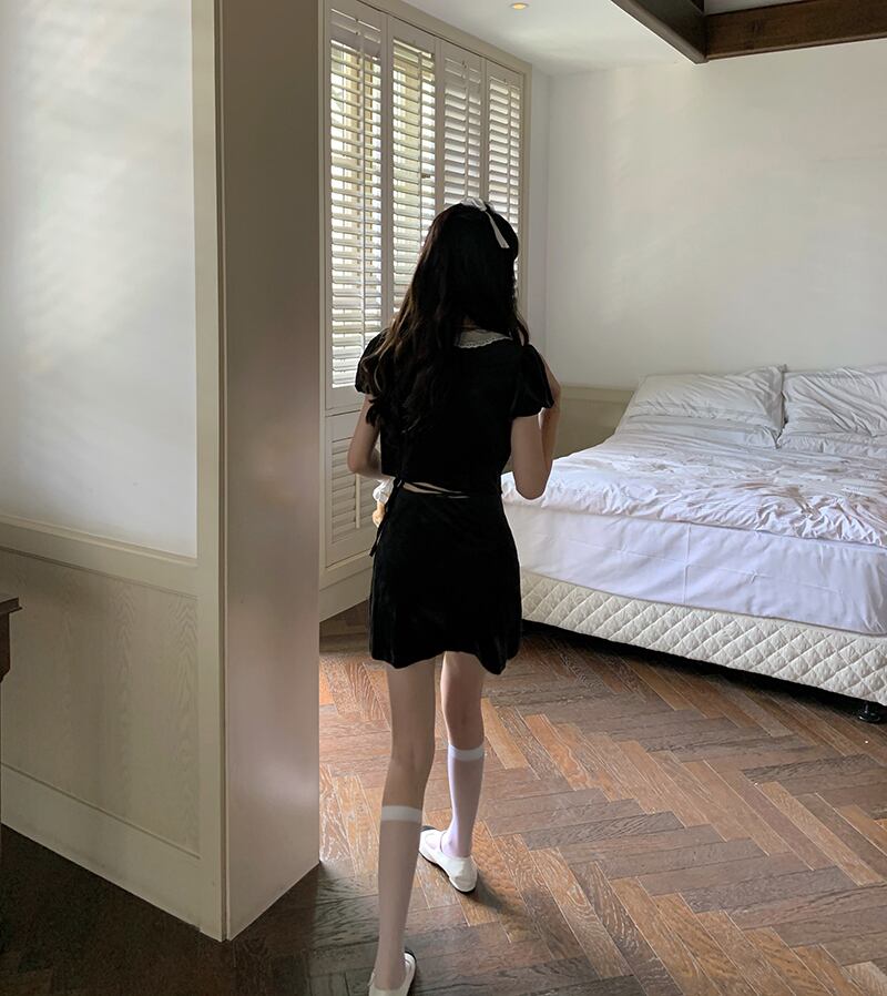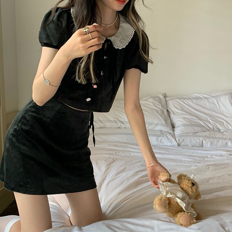 ブラックベルベットカラーシャツ サマーハイウェストウェストショートトップス ドレス 夏物 タオタオイ53622009692