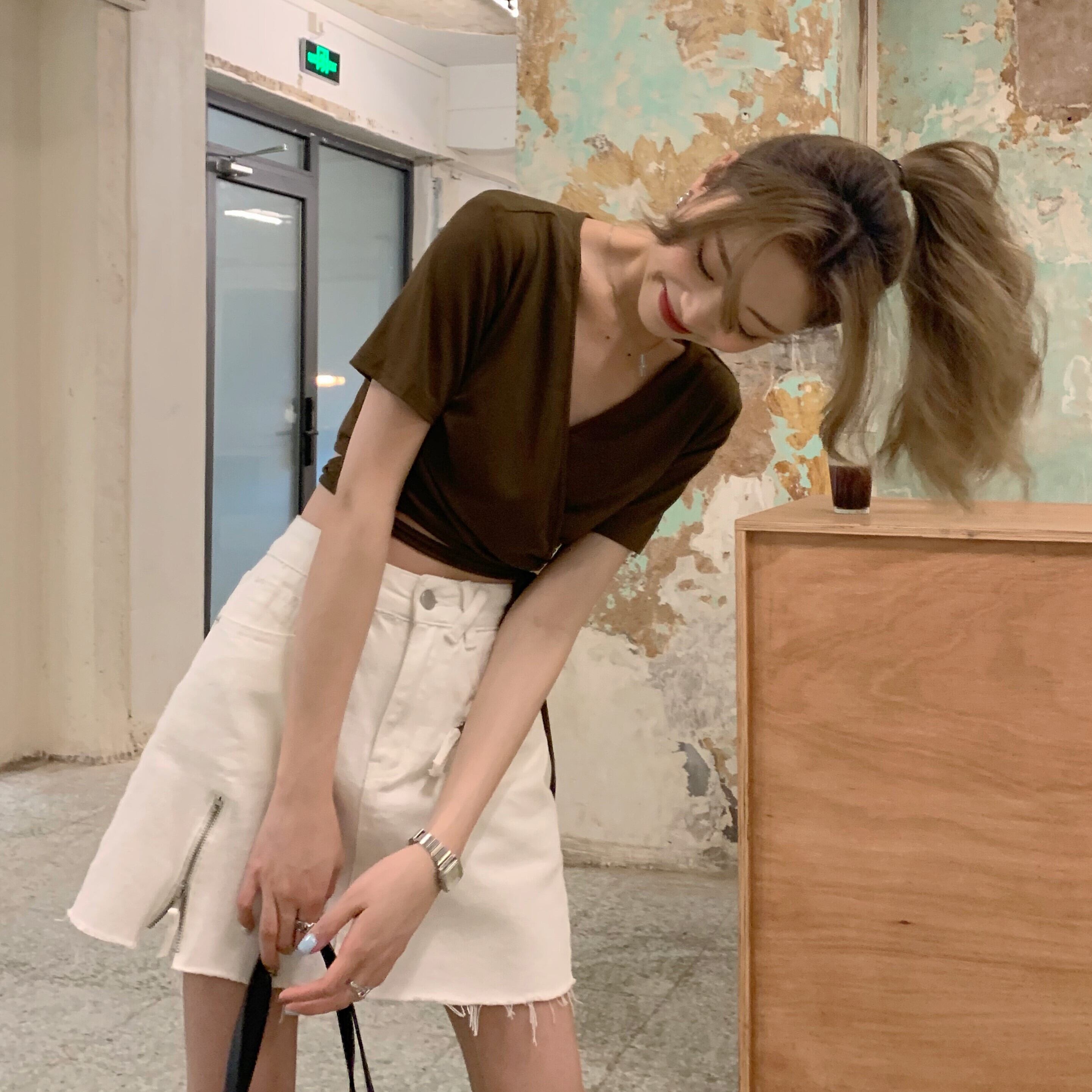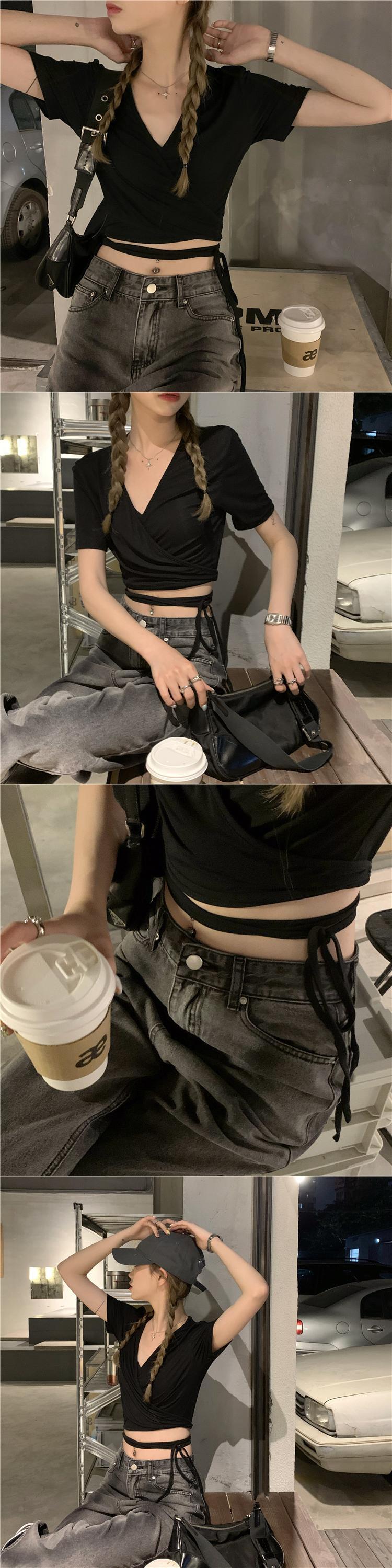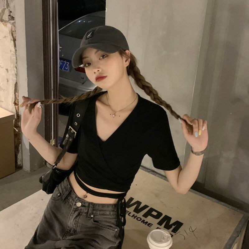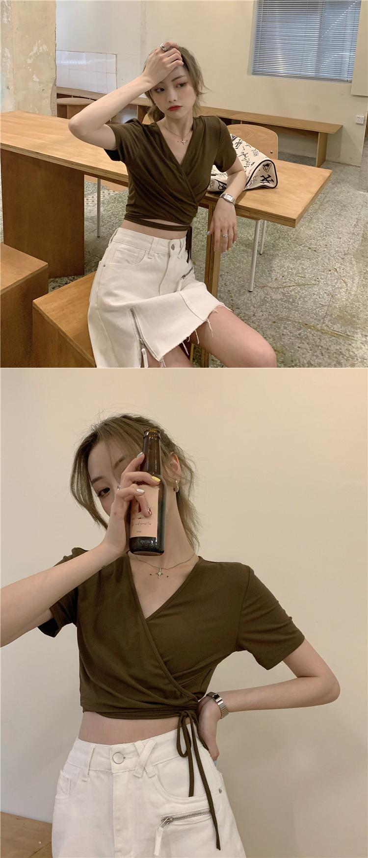 VネックショートTシャツ サマーレッドハイウェストウェストトップス 夏物 タオタオイ7258565484