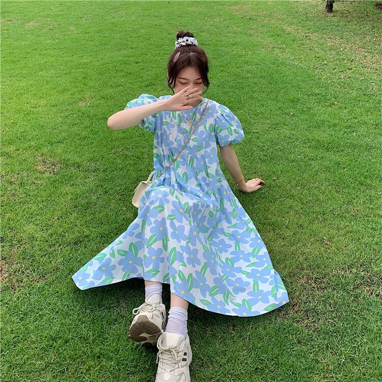 Flowerデザイン スリーブドレス サマースタンダードスタイルロングスカート レトロ 夏物 フラワーデザイン タオタオイ42429245859